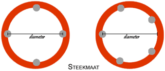 De steekmaat is de afstand tussen de boutgaten van de velg voor de aanhangwagen. De steekmaat wordt weergegeven in 2 cijfers nl. het aantal boutgaten ( 4,5 of 6) en de afstand van de boutgaten hart op hart. Bij 4 en 6 gats velgen is dit makkelijk te meten omdat de gaten recht tegenover elkaar staan. Bij 5 gats velgen is dit iets lastiger. In onderstaande afbeelding zie je dat er vanuit het hart van een boutgat een denkbeeldige cirkel getrokken moet worden om de juiste afmeting te bepalen.